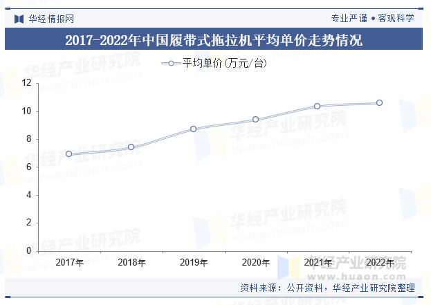 全体上,我国履带式拖沓机的平均单价呈持续上涨走势,即便正在销量呈现下滑的2018年,其平均单价都较上一年上涨了7。19%。到了2022年,我国履带拖沓机平均单价为10。57万元/台,超出跨越2017年3。7万元,价钱增幅高达53%,平均单价的上涨次要取出产成本添加以及补助尺度添加有很大关系。